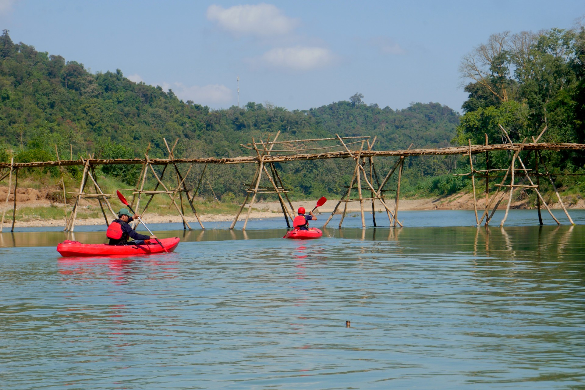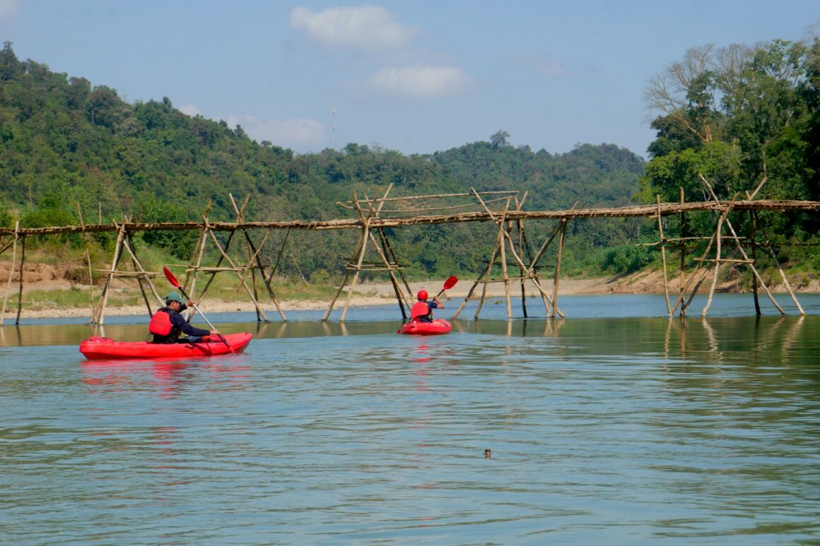 Vom Dorf aus folgen wir der Straße hinunter zum Flussufer, wo sich unser Transportmittel ändert: Wir tauschen Stiefel gegen Boote. Wir steigen in unsere Kajaks und lassen uns von der Strömung den Nam Khan Fluss hinuntertragen. Wir treiben an üppigen Dschungelufern vorbei und halten an einem ruhigen Ufer für ein Picknick am Fluss.